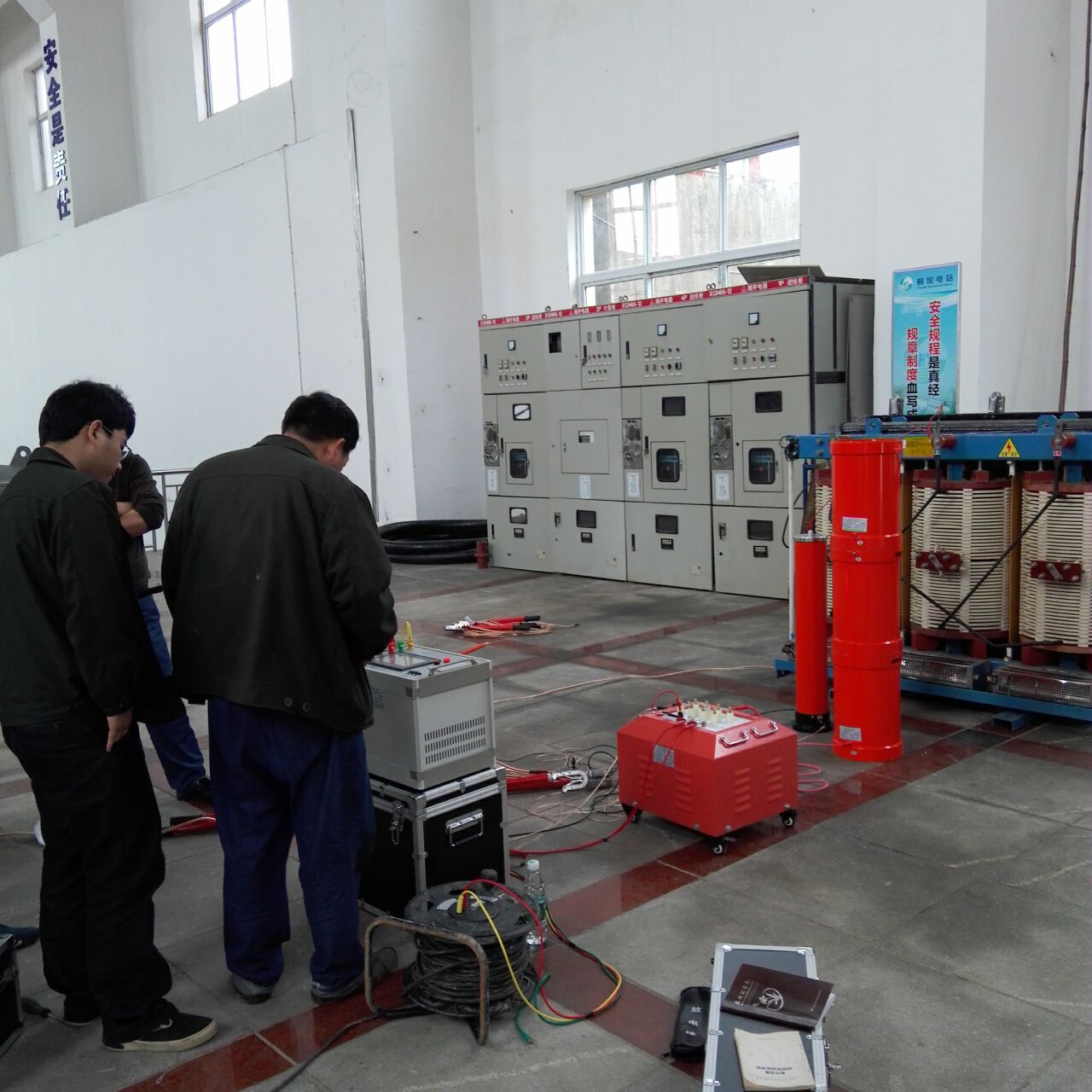 此次培訓的重點設備是YTC850-135kVA/108kV變頻串聯諧振試驗裝置。我公司的該設備為專利產品,諧振電源調頻及功率元件使用先進的日本進口的優質元器件,設計的是諧振式濾波電路,能改善輸出電壓的波形畸變,獲得很好的正弦波形,有效的防止了諧波峰值對試品的誤擊穿。變頻電源保護功能強,穩定性好;具備具備全自動(自動調諧、自動升壓)、全手動(手動調諧、手動升壓)以及半自動(自動調諧、手動升壓及手動調諧、自動升壓)的多種工作模式,可任意切換使用;操作方便;大屏幕觸摸LED液晶彩屏和外接鼠標直接完成各種參數的設置,試驗結果可保存、打印、上傳、回查等。