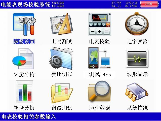 參數設置界面用于調整試驗前所需要確定的數據。包括:PT變比、CT變比、電表常數、設定圈數、接線方式、輸入方式、電流輸入、設置日期、設置時間、電表編號。
