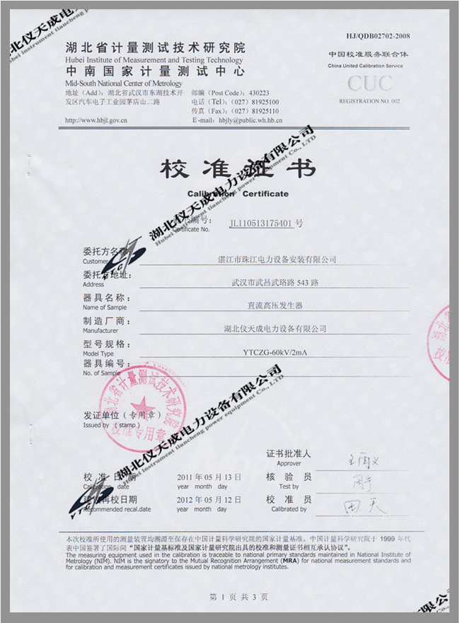 轉載:"YTCZG-60kV/2mA直流高壓發生器鑒定證書" 請注明來源于儀天成電力。 更多技術問題請致電儀天成電力客戶服務:027-87876585,技術部專線:027-87876585,在線客服:719388481